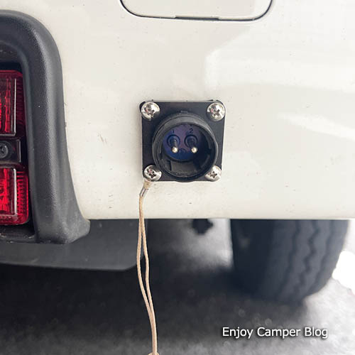 普通中古車というのは現状渡しが原則なので、後から追加装備の注文はできないものですし、まして、車体工事を伴うOP追加なんて絶対に飲んで貰えない要求かとおもいきや、「グループ会社のジェームズ相模原に運んで施工するので可能」とのことで、外部電源が装備された状態で納車されました。
