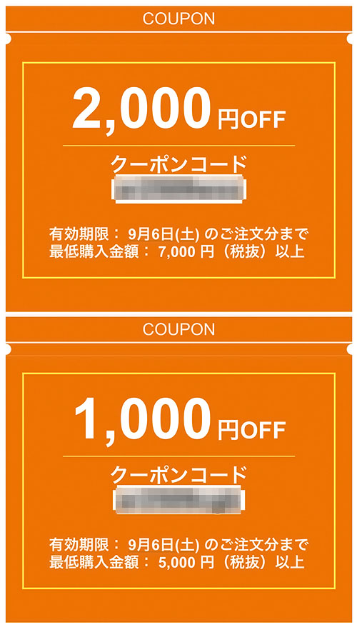 最低7000円購入で2000円割引は最大「28.5%」の割引、最低5000円購入で1000円割引は最大「20%」の割引に相当します。