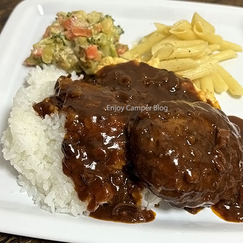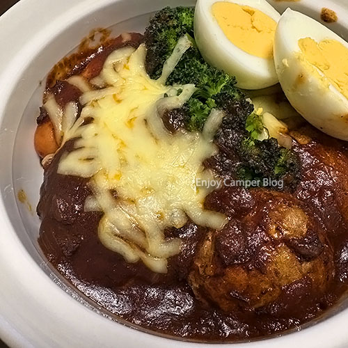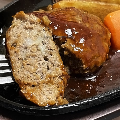 強めの塩コショウと、あとはビーフハヤシのデミグラスソースで、キャンプでも手軽においしいハンバーグを食べることができます。