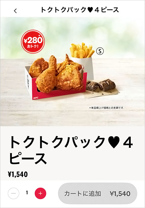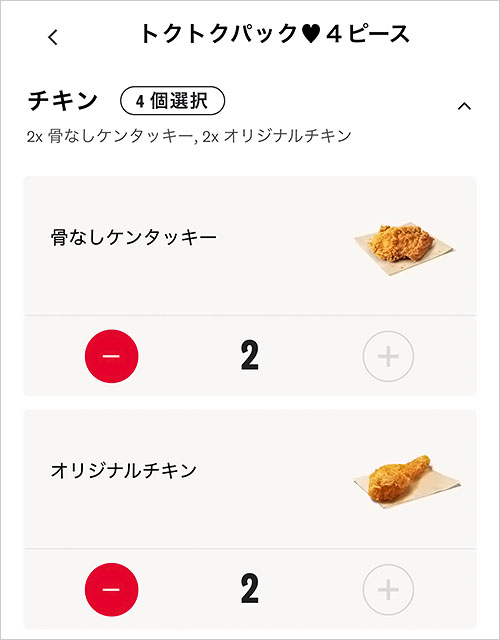 セットの場合は、チキンやサイドの細かな注文が可能です。写真の場合は、「トクトクパック4ピース」のチキン4つを、「骨なしケンタッキー」と「オリジナルチキン」を自由に組み合わせて、好きな4ピースを指定できる…といった具合です。