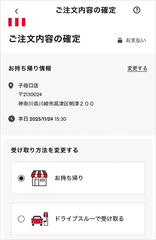 注文内容の確認が出るので、内容を確認します。購入店舗と指定時刻に間違いがないか、「持ち帰り」か「ドライブスルー受け取り」かを指定します。