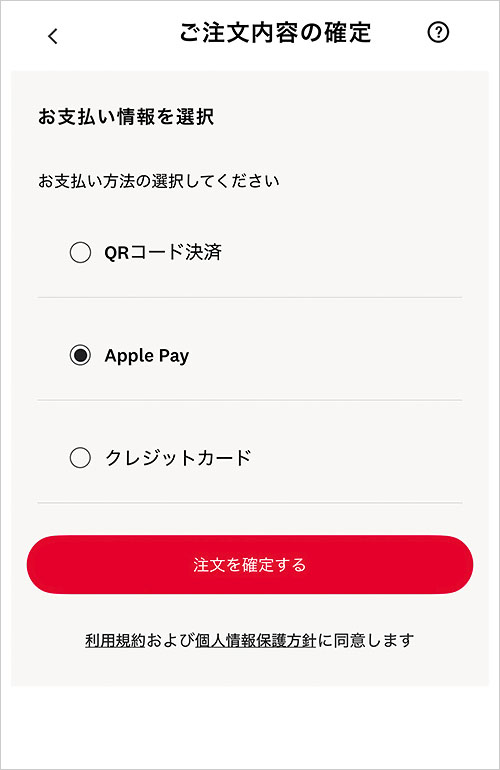 支払い(決済)方法を選び「注文を確定する」でモバイルオーダーが完了します。あとは、指定時間までに店舗へ出向いて、注文品を受け取るだけです。