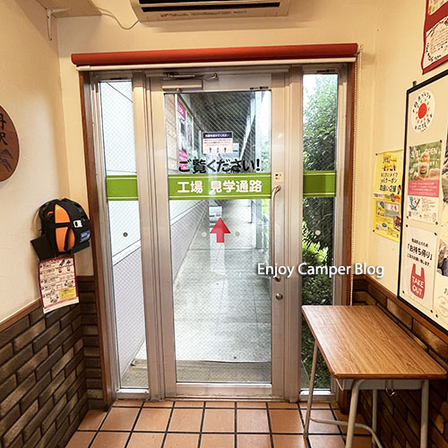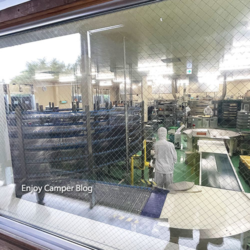本社工場建物の入り口を入ると、売り場とは別の扉があってそこから工場の外周からガラス越しにパンの製造の様子を見学することができます。
