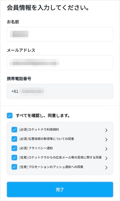 最後に「名前」と「メールアドレス」を入力し、同意次項にチェックを入れて「完了」です(電話番号は自動的に入ります)。