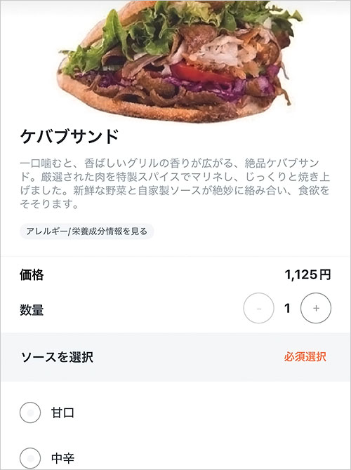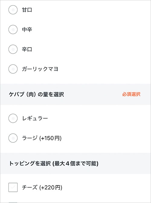 商品を選び、ソースや肉量、ボウルはご飯の量、トッピングなどを指定します。