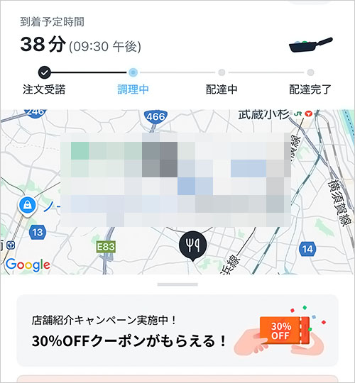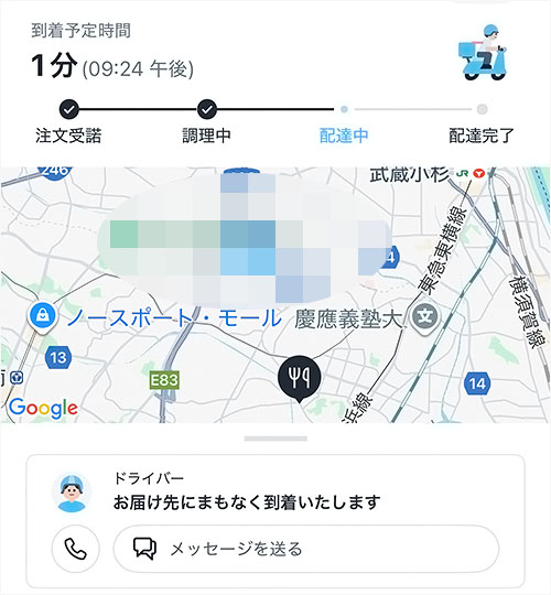 少しずつ到着予定時間までのカウントダウンが進行して、1分前の時点での到着予定時間は9:24となgっており、調理や配達含めて当初予定より6分間短縮されたことになります。