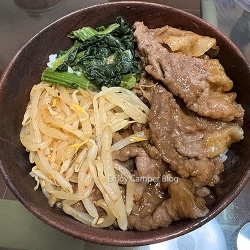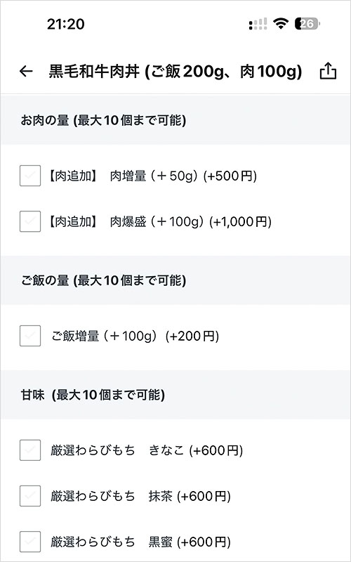 「肉増量」(50gまたは100g)や、「ご飯増量」、さらに甘味や追加トッピングの有無を指定できます。今回の注文ではちょっと警戒して何も追加しませんでした^^;