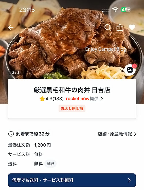 こちらのお店は『お店と同価格』でデリバリ可能だそうです。評価も「4.3」と悪くない感じです。写真を見るとかなりボリュームがあって美味しそうです。