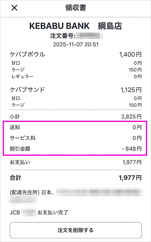 こちらが領収書。ケバブボウル1,400円+肉ラージ150円、ケバブサンド1,125円+肉ラージ150円で合計2,850円、送料・サービス料はいずれも0円で「送料・サービス料無料」に偽りなし。今回もクーポン適用で-848円が割引になり、決済額は1,977円でした。