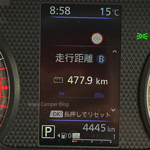 この時点ではまだ「給油してください」の表示は出ていません。自宅周辺の市街地での使用後の給油で約20Lの給油量でしたので、少なくとも燃料タンクには7Lを超える燃料が残っていることになります。