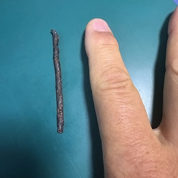 写真のような釘(?)状の金属が左後輪に刺さっているのが見つかり、サイドウオールを傷つけているということで、交換せざるを得なくなりました。
